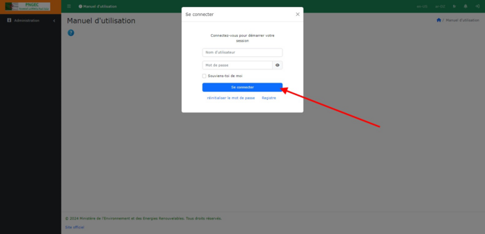 Accès à la Plateforme Pour accéder à la PNGEC, il faut : Aller à la page d’accueil https://pngec.dz/ Entrer le nom d’utilisateur et le mot de passe dans les champs réservés Cliquer sur « se connecter »